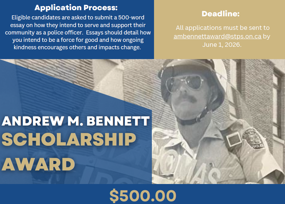 The Andrew M. Bennett Scholarship Award will be presented to a 2026 graduating student from a St. Thomas or Elgin County secondary school who is planning to pursue a career in policing. The successful applicant will demonstrate strong academic achievement, integrity, initiative, leadership, kindness toward others, dedication to teamwork, and a commitment to making a meaningful difference in their community.